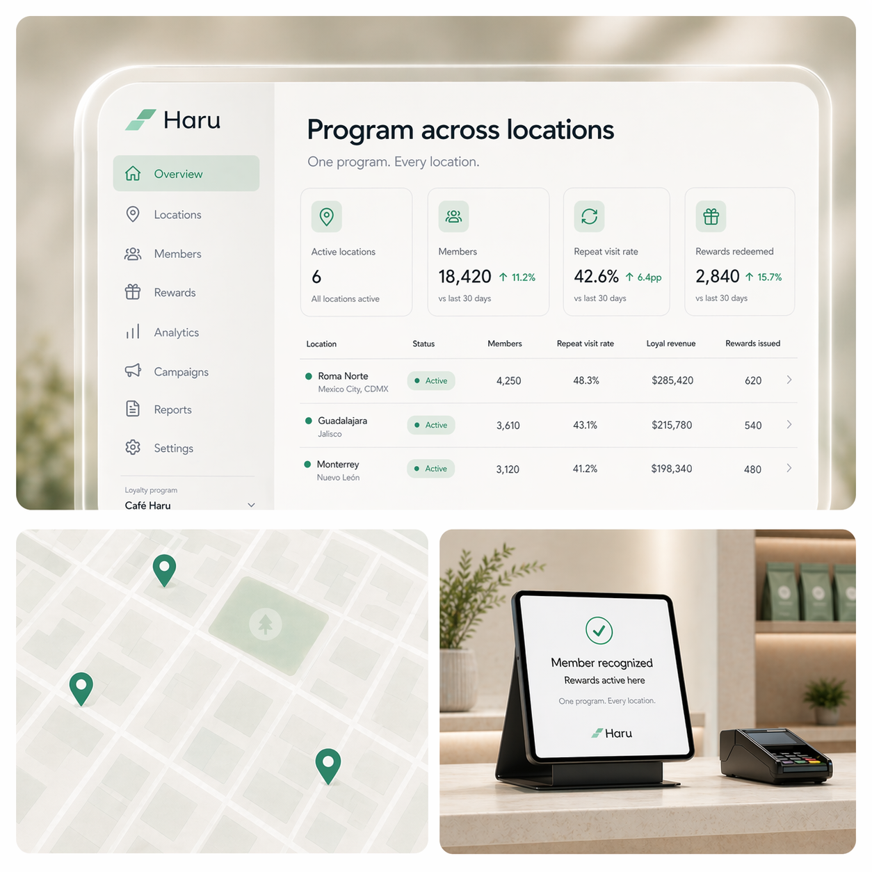 Haru runs as one loyalty program across every store, channel, and team you operate. One customer view, one source of truth, and rewards that follow the customer — not the location. Add new locations the day you open them.